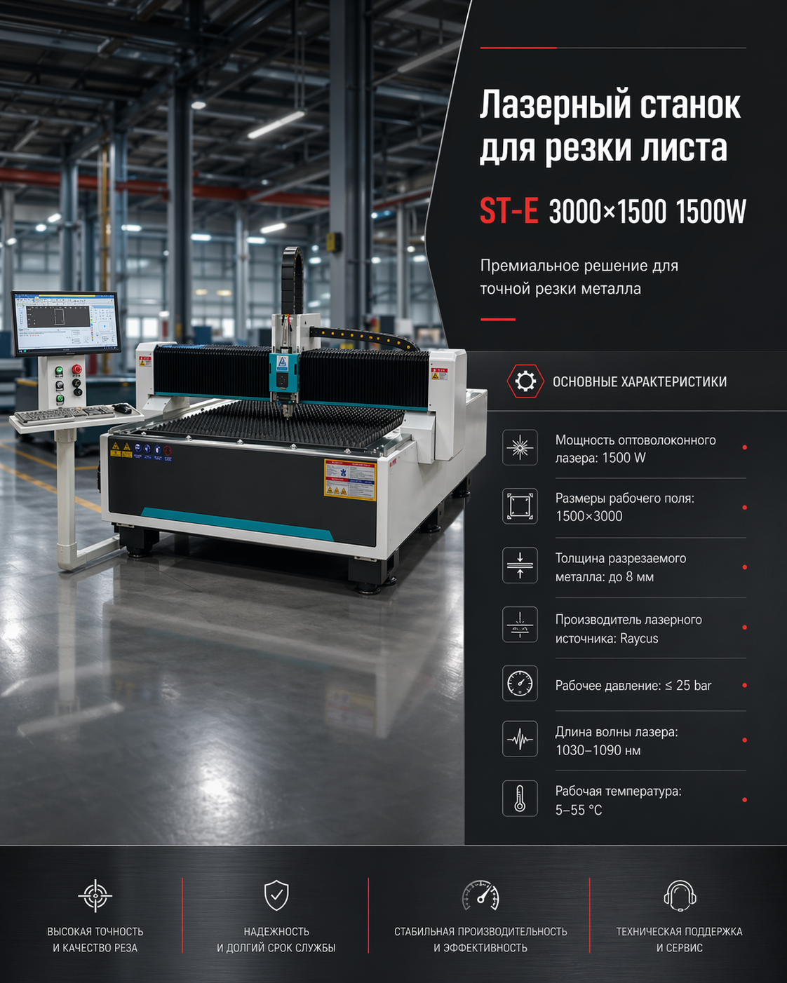 Станок оснащается надежным волоконным лазерным источником Raycus 1500W в исполнении CE, что обеспечивает стабильную работу, высокую точность обработки и аккуратную кромку реза. Рабочая зона 3000×1500 мм позволяет обрабатывать стандартные листы металла и выполнять широкий спектр производственных задач.