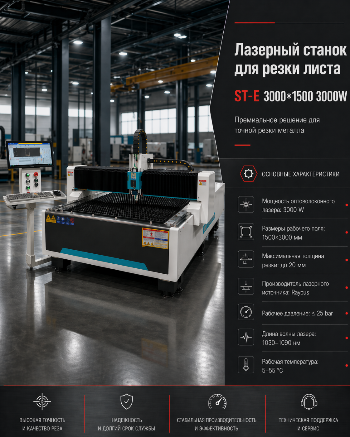Лазерный станок для резки листа ST-E 3000*1500 3000W — это производительное и современное решение для высокоточной резки листового металла. Станок отлично подходит для небольших и средних производств, металлообрабатывающих цехов, заготовительных участков и мастерских, где требуется более высокая мощность, стабильное качество реза и расширенные возможности по толщине обрабатываемого металла.
